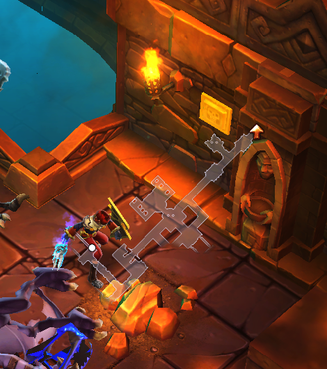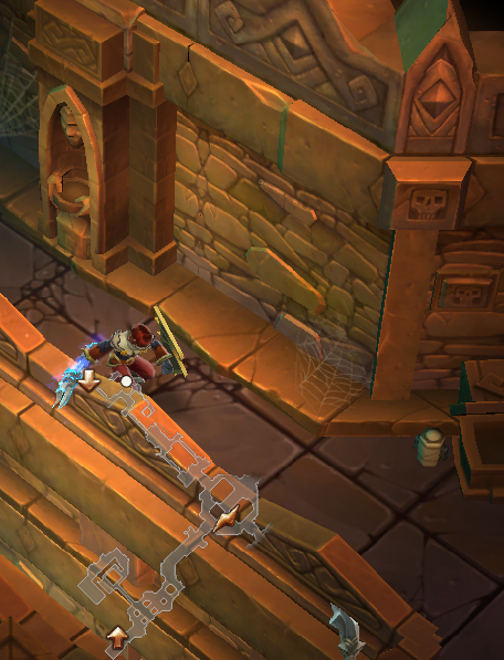 现在揭秘最后一个密室的开关,就是现在站的地方的那个正常的骷髅图案……我发现的时候实在找不到了(被惯性思维骗了,以为都是在比较低的位置,找了半天),最后在一屏内挨个点骷髅,终于找到了……