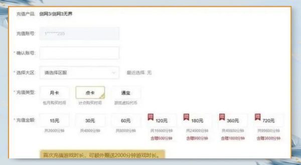点卡同样提供15元、30元、60元三个不同档次,分别对应2000分钟、4000分钟和8000分钟的游玩时间。此外,还有首次充值时长,可额外赠送2000分钟的福利。