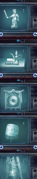 9、根据之前电视机中获得图片的图片和数字以及天上北斗七星来进行点击:①-奘铃;③-皮影;⑤-锣;⑥-伞;⑦-酒壶