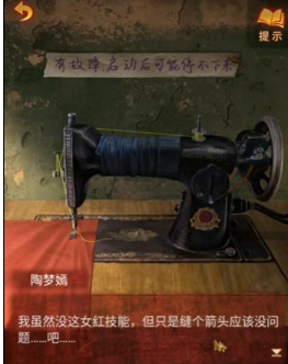 13、将线轴、红盖头和针放到缝纫机上缝制可以拿到红布,最后把红布放在这里就能通关了。