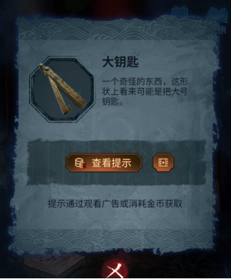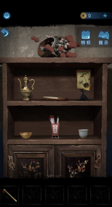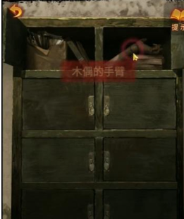 3、将木偶头放到神龛,近距离观察报纸,选择书本下的抽屉解开铁钩,转向颜料桌得到画笔。