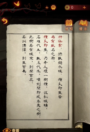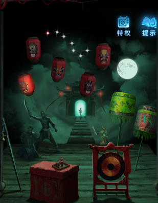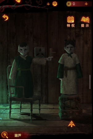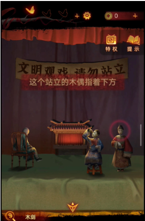 8、望远镜道具使用处在观察戏台上,这时利用葫芦放到中间小人位置,掉落木剑道具,随后将木剑在放到男童手中,可以蝴蝶板凳,在将板凳放到戏台右边小人上,然后在使用望远镜查看戏台处,这时可以获得酒壶。