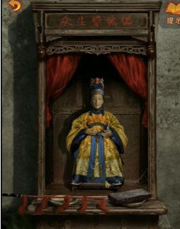 12、先将把马鞭放到贡台上,再将摇把放在此处就能看到木偶并拿到小面具了,将小面具给石像戴上拿到针。