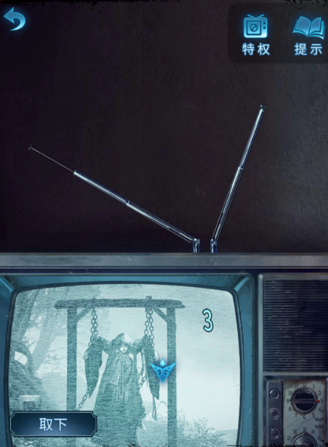 5、然后找到教室里的电视机,将“铁条”放入到天线上,根据日记的线索来调整电视机,步骤如下图。