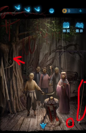 22、点击现代小屋点击蝴蝶,将大头贴贴到皮影上,离开来到外面,点击绑着的人偶。