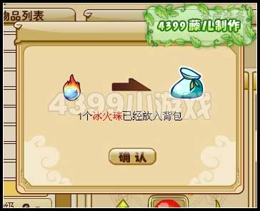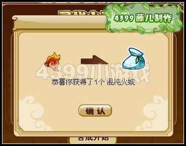 在合成过程中使用“冰火珠”是100%成功的哟~这样我们就可以获得1个混沌火灵犬的孵化道具:混沌火绒