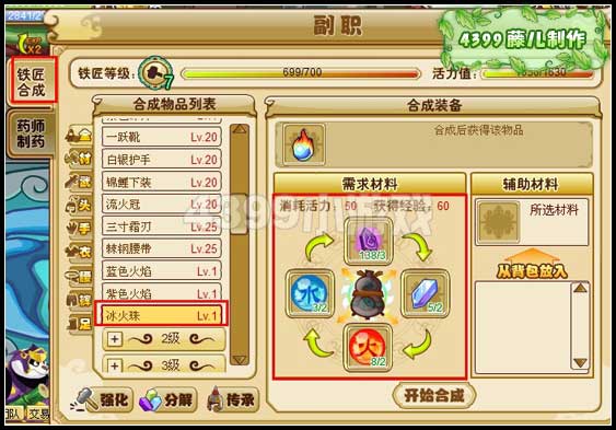 好吧,先要合成一个冰火珠,关掉刚才的孵化道具窗,打开副职窗口,铁匠合成1级里有个冰火珠合成