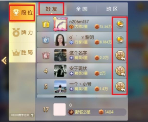 第二步,点击“段位榜”,弹出段位的排行页面,在页面上可见好友的段位排名和赠送游戏豆的图标。