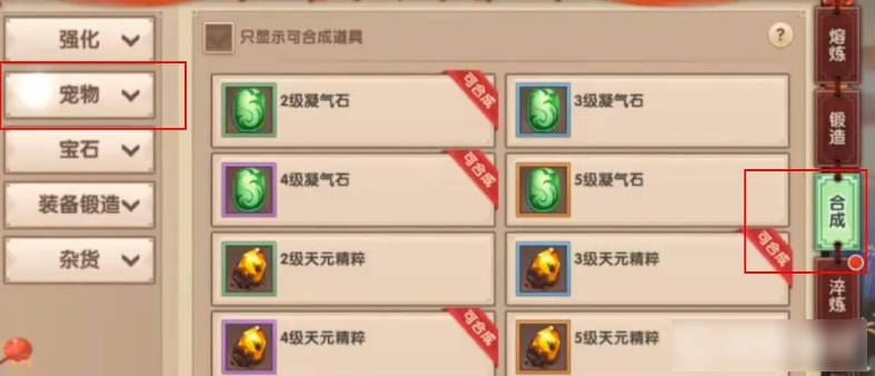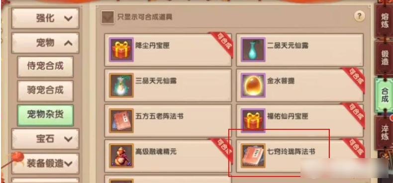 1、七窍玲珑阵法可以刷门派贡献和善心获得,在右下角炼器,找到合成,选择左边的宠物。