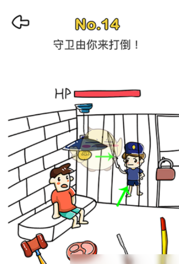进入第14关后,将门卫手里的刀移动到腰那,14关通关,点击“下一关”。