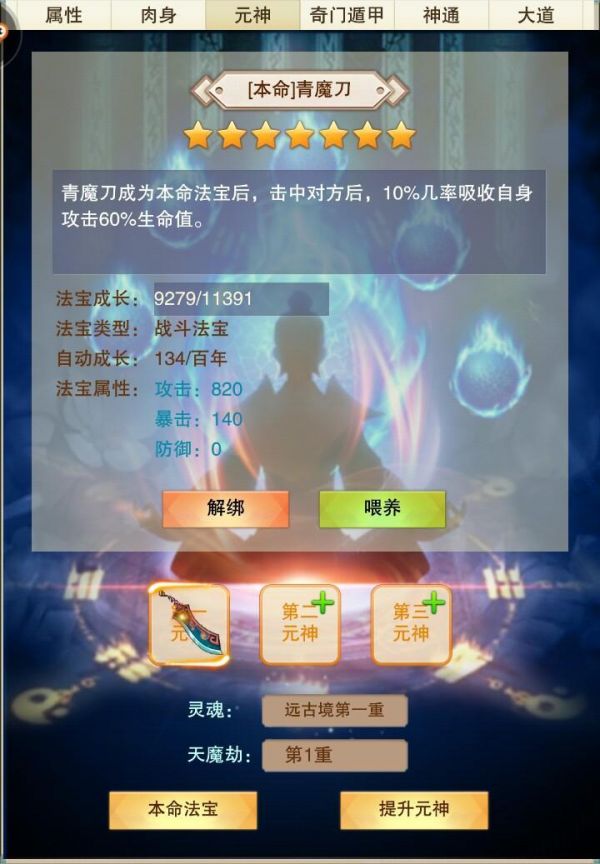 辅助类本命法宝只能装备于第二第三元神,无法装备于第一元神。