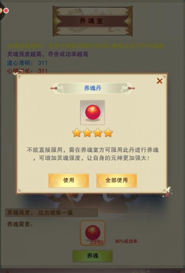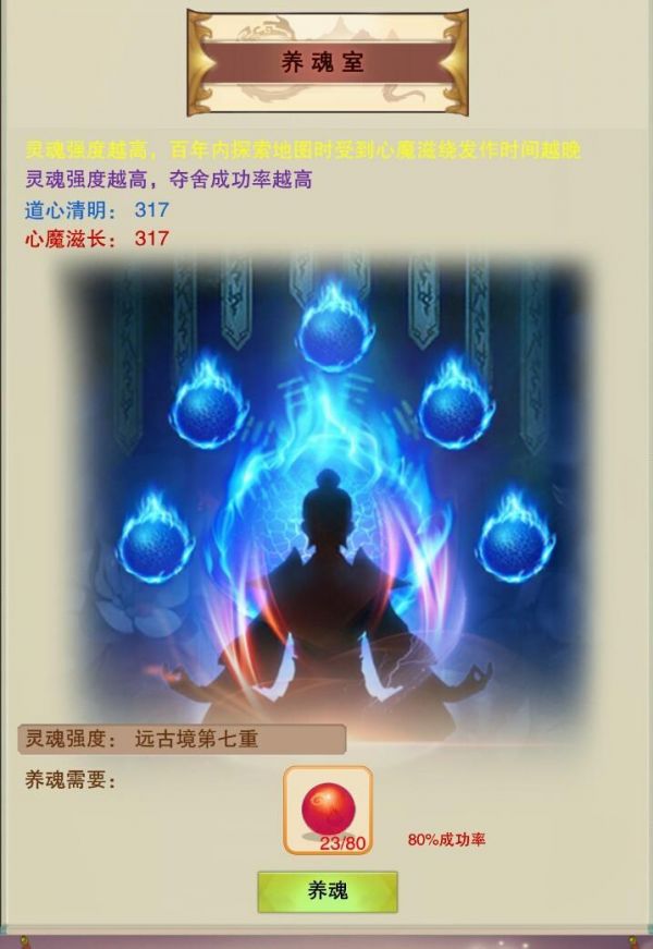 只有境界达到分神期,才能在“仙居”的“养魂室”内提升灵魂境界。灵魂境界只能通过服用养魂丹增加,境界越高,提升境界所耗费的养魂丹数量就越多。