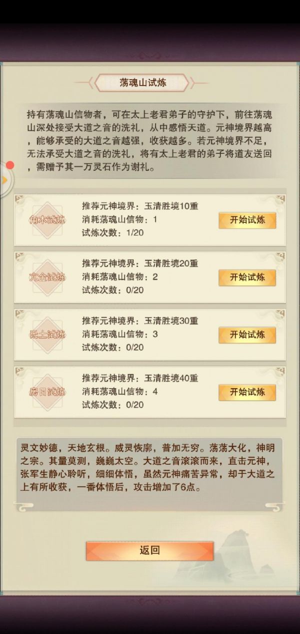 元神境界达到对应要求时即可接受大道之音洗礼,如果元神境界不足,大概率试炼失败,白白浪费荡魂山信物。