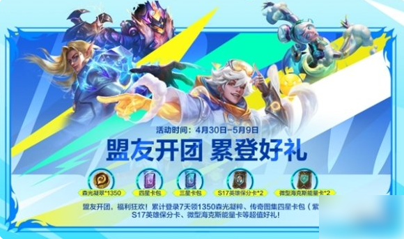 2、累计登录7天领1350森光凝粹、传奇图集四星卡包(紫)、S17英雄保分卡、微型海克斯能量卡等超值好礼。