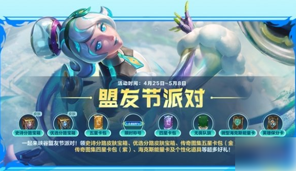 3、参与盟友节派对领史诗分路皮肤宝箱、优选分路皮肤宝箱、传奇图集五星卡包(金)、限时盟友节称号、传奇图集四星卡包(紫)、海克斯能量卡及个性化道具等超多好礼。