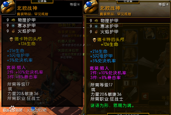 4.在牛头BOSS门前留个传送门,背包满了不要让宝宝回城,自己开传送门回城看看商店,然后顺带刷牛头。不为3%免伤,为的是Level 14 的猎人套装戒指部分——北欧战神。