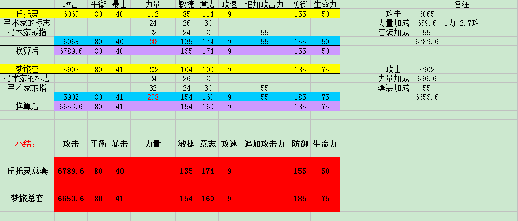 上图分3个区域,左上是各式饰品的属性;左下是以丘麟弓为武器,搭配腰带,戒指的属性;右下是以左下较佳方案,搭配职业标志,戒指后的总属性。(太阳之戒实际是大海之戒,对不起,太困了。下同。)