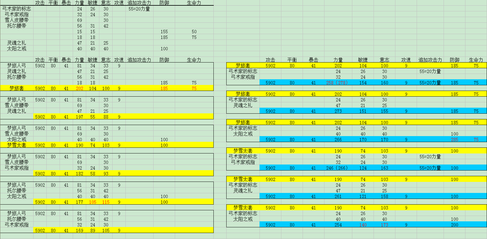 从图中,不难看出:若以梦旅弓为武器的话,搭配托尔2件套+职业饰品是伤害最高的。