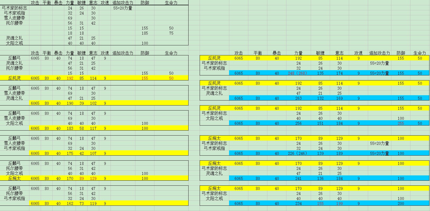从图中,不难看出:以丘麟弓为武器的话,搭配托尔2件套+职业饰品是伤害最高的。
