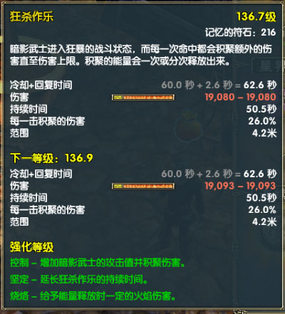 坚定——重要。增加狂杀的持续时间。和鼓舞一样,狂杀除了有两次喷发全程增加攻击值。而且这两个战技CD和持续时间都很接近,狂杀与鼓舞令组成连续技,极大提升暗影的攻击值,装备上的必中、减闪等命中属性在高攻击值的前提下效果更好。