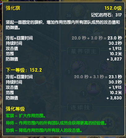 恐惧——重要。150级强化旗,降低敌人80%左右的攻击值,实际上在强化旗作用下,敌人想摸到暗影一下非常考RP。