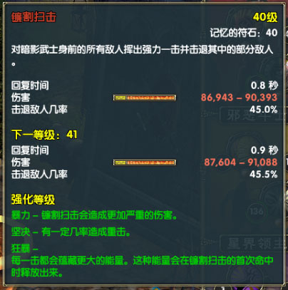 狂暴——重要。蕴藏能量,实际上是增加镰割以后那一次攻击的伤害。刷怪的连续技我喜欢镰割放在第一个,镰割接魔力和暴跳,点右键镰割一直接镰割也行。(好比说设置了三个战技的连续技,只点一下会把这三个战技依次施展,中途点右键,第一战技可以取消后面两个。比如镰割接暴跳,如果敌人不多了,就让暴跳清场,还有很多敌人扎堆就一直镰割好了)。
