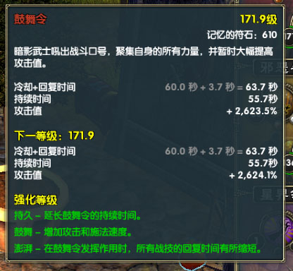澎湃——必须。大幅缩短所有战技的回复时间,鼓舞令的精华所在。鼓舞令的等级越高效果越显著。此170级的鼓舞令可以把1.4秒回复的暴跳减少到0.7秒,因为后期鼓舞令的持续时间可以接近CD+RT,也就是大部分时间处于鼓舞令状态下,此时可以把主力战技(魔力,镰割,暴跳)提高到原来1.5倍~2倍回复时间的更高等级战技。鼓舞令的最终效果是大幅提高暗影的输出能力。