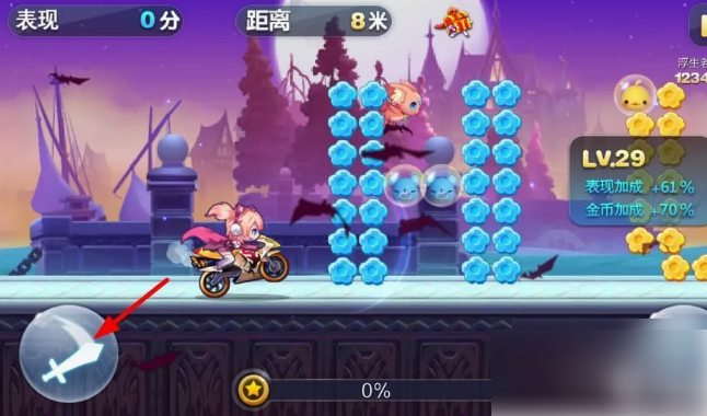 2、进入进击模式开始后,我们可以看到游戏左下方有一个类似剑的图标,点击这个图标可以击杀一些障碍物(小怪)。