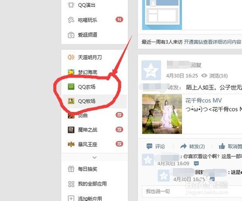 进入QQ空间后,下拉页面,我们就可以在左边的应用框里看到QQ农场和QQ牧场,小伙伴们可以按照自己的喜好进入游戏。