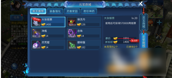 用户可以在元宝商城中花费1400元宝可以兑换57万的银票,但是一周只能换两次。