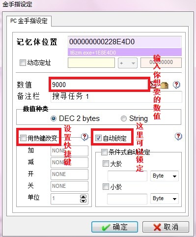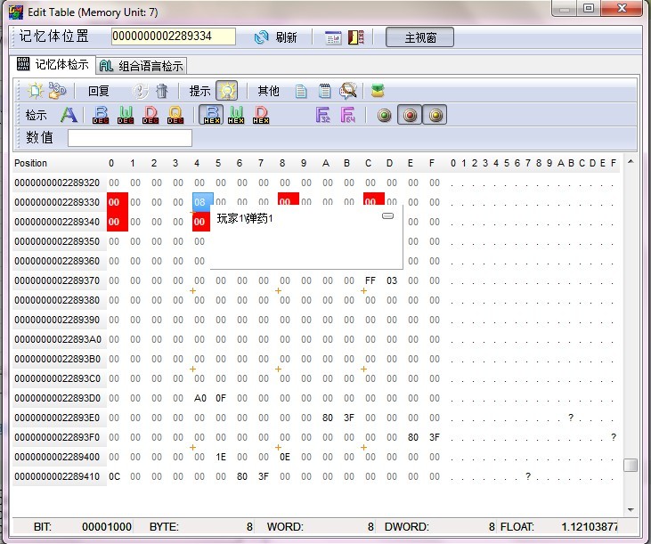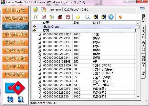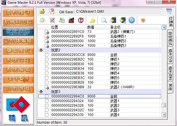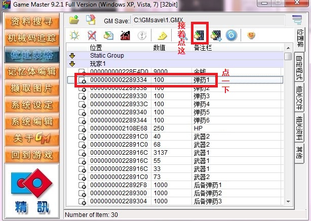 锁全部的方法是,先找到一把枪的子弹位置,让后锁定,到GM左边【位置表格】那,先点击一下,选择上面的【编辑记忆体】,选择地址周围每隔3个00就是一个弹药的位置,点左上角新增,把周围的6个全锁了就行。