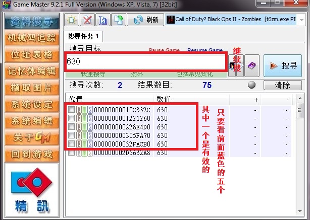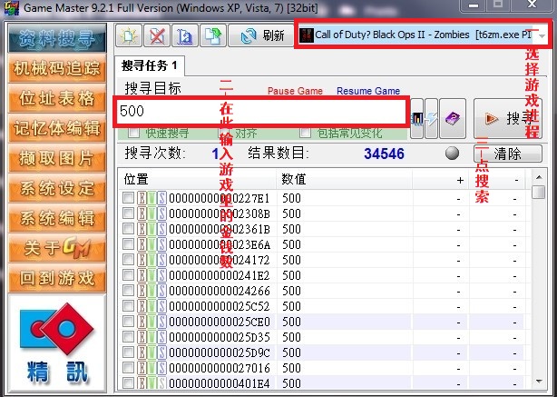 再打开GM,在程序选择那选择cod9 zombie。先说说钱吧,搜索目标那写入你现有的金钱,搜索,出来一堆结果.