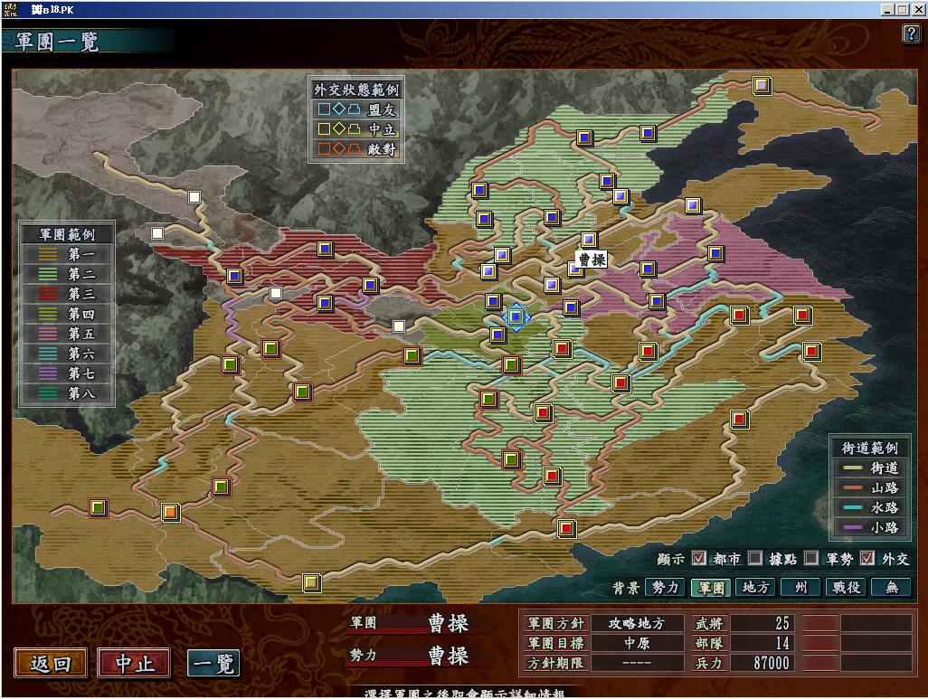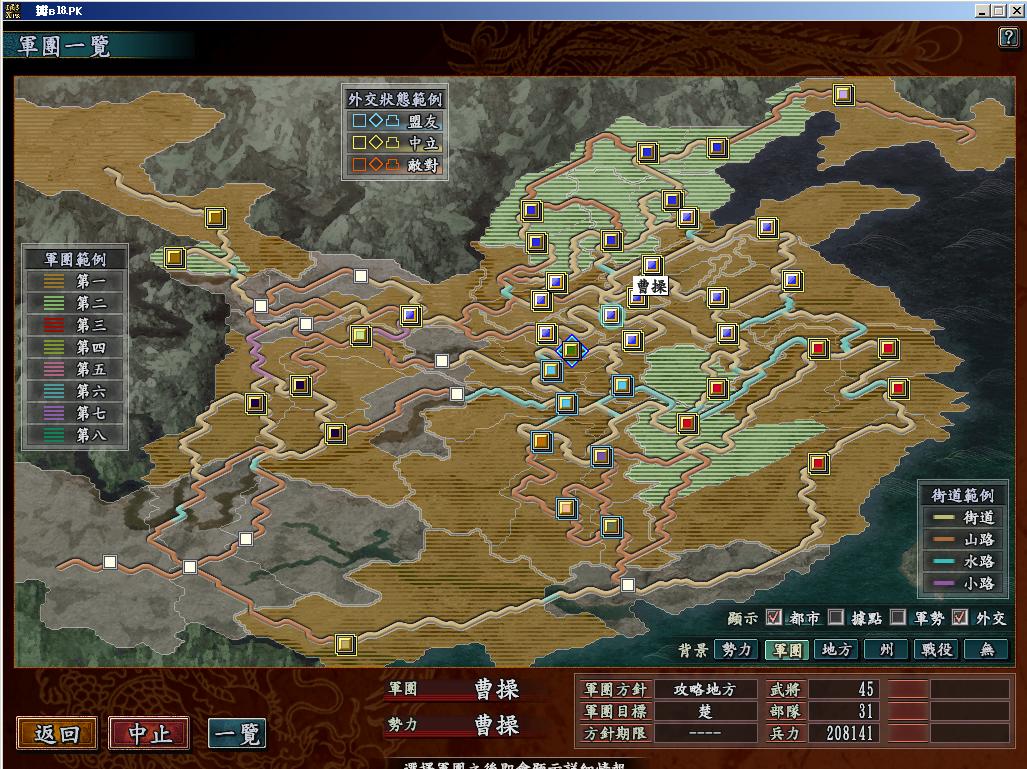在每次战役之后,电脑的军团攻略都会初始化。电脑的军团攻略目标分为州攻略、地方攻略、势力攻略等,州功率和地方功率都会优先选取己方有所属城市的地域制定。曹操与袁绍大战之后,占领了除了淮南和汝南的整个中原。