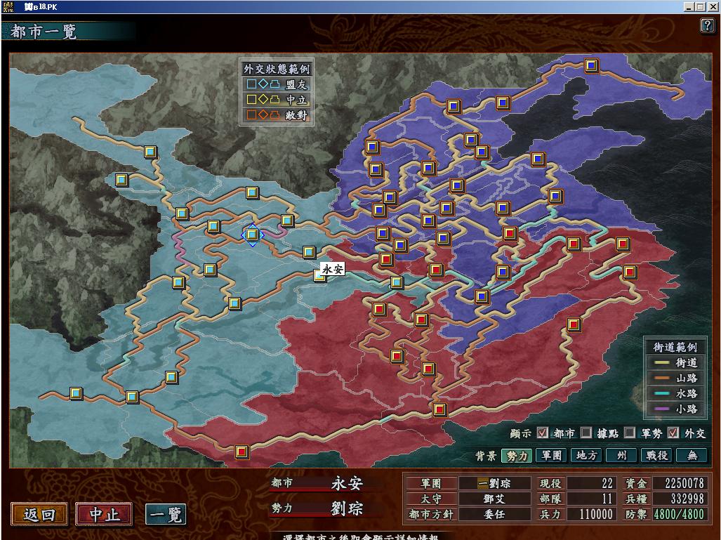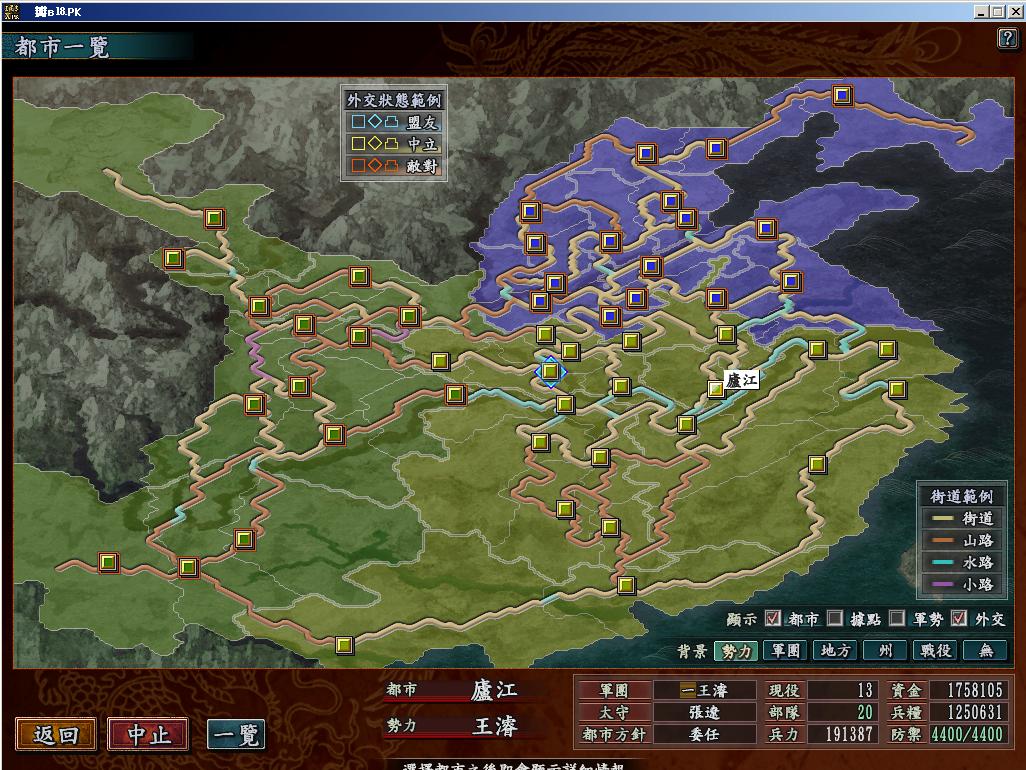 这个是由荆州防守巴蜀的,江陵旁边的夷陵修了个城寨,奇怪的是每次城寨被打,电脑老是江夏出兵防守跑的远了点,不过因为不在同一地域电脑很少打。荆北有我亲自坐镇,不过打仗还是靠太守,宛城前面空着个许昌,新野前面空着汝南,太守和北方打的很爽。淮南占领庐江,空着寿春用来争夺这样电脑新征的兵全部消耗掉了,对你没有任何威胁,有孩子可以安心带孩子,想修炼也放心。如果空城被占了,就给太守个指令让他打回来,还能猛涨功绩,这样你的太守过不久就能混个一品官当当,我一向把边境城市当成高官培养中心,自己只带到三品官。