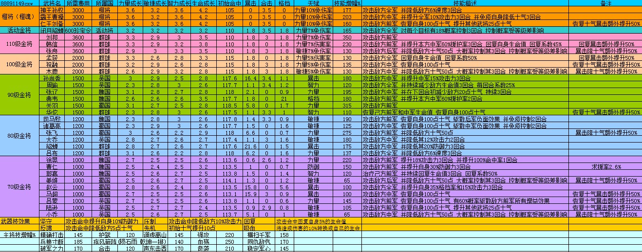 在龙将中用户想要获得最强力的金将是一件很不容易的事情,一般都需要用户投入不等量的游戏币。但是毫无疑问金将的属性不能让你失望的,下面的数据表能够让你请吃高等级武将的属性技能效果。