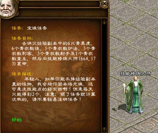50级及以上用户可在王城、凤凰城NPC“技能修炼大师”处接取“宝珠任务”,要求用户去消灭经验副本中的怪物,完成后获得“固本培元珠”,每天可领取两次任务。“固本培元珠”和“易筋宝珠”在“技能修炼大师”处可合成“强化易筋宝珠”。使用“强化易筋宝珠”,洗点可返还全部经验和80%金钱。