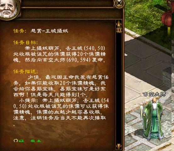 50级及以上用户每天可到王城npc玄空大师处领取一次悬赏-王城摄妖任务,使用摄妖葫芦到王城540,50处收服被诅咒的侏儒,就能获得一个易筋宝珠。摄妖葫芦可使用蓝,白装备换取,也可以直接到异域商人处购买,侏儒的血量越低,收服的成功率越高。