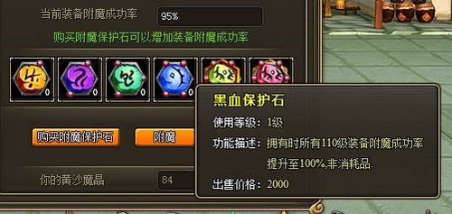 当然,如果不想因为成功率的关系浪费了千辛万苦打回来的魔晶,用户也可以选择购买附魔保护石,使用了附魔保护石,就可以让附魔百分之百成功地进行了!37wan《龙将》中的附魔保护石在商城中购买,也有等级的区分,在购买时,你可要千万看清楚自己所需要的附魔保护石等级哦!更激动人心的是,附魔保护石是非消耗品,只需购买一个后,该等级阶段所有装备附魔成功率直接提升至100%!