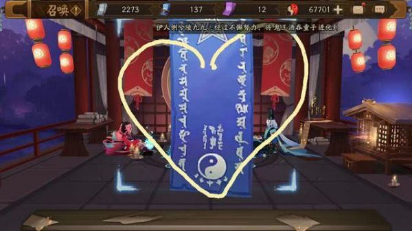严格来说这次活动的触发其实不需要画爱心这么复杂,真正触发的地方在两个点,所以画V字也是没问题的。V顶端的两头分别对应到红布旁边的柱子上头顶上正好盖在或者穿过神乐和晴明的头部即可,中间的角度尽量在中间。