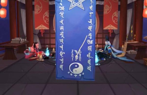 如果你连V字都懒得画的话,可以考虑一下画斜线触发,这才是触发这次神秘图案的核心,具体的起点在右侧红布的柱子向左侧斜着画一条,正好保证穿过红布右下角同时改过晴明阿爸的脸,具体停止的地方在太极图的原色黑点的地方即可,画完后的样子差不多如图所示。