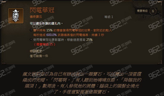 击中时有 15% 的机会获得闪电华冠的效果,对附近的敌人每秒造成 600.0% 武器伤害值的闪电伤害,持续 3 秒